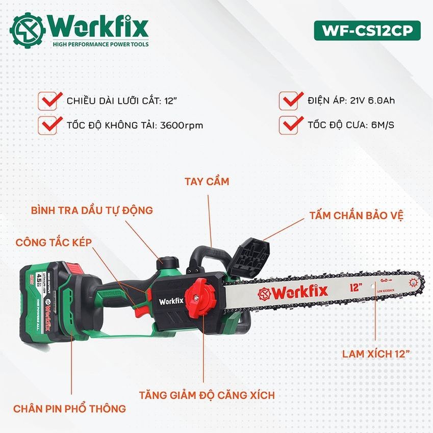Máy cưa xích pin Workfix WF-CS12CP (12 inch) - Tự động tra nhớt